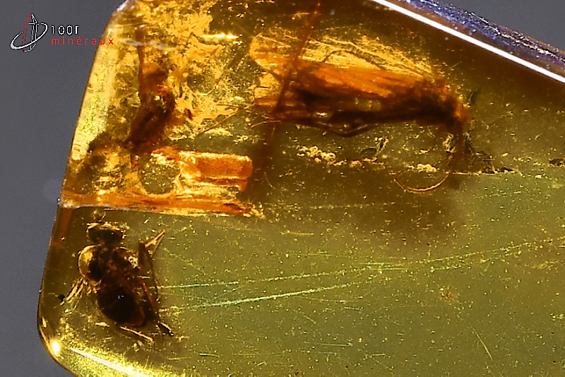 Spécimen d'Ambre fossile jaune-orangé avec insecte principal Trichoptera.