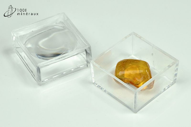 Spécimen d'Ambre fossile jaune-orangé. Présentation en boîtier-loupe.