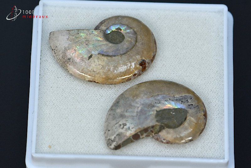 Spécimen irisé, scié et poli d'une Ammonite Cleoniceras du Crétacé supérieur (-90 Ma).