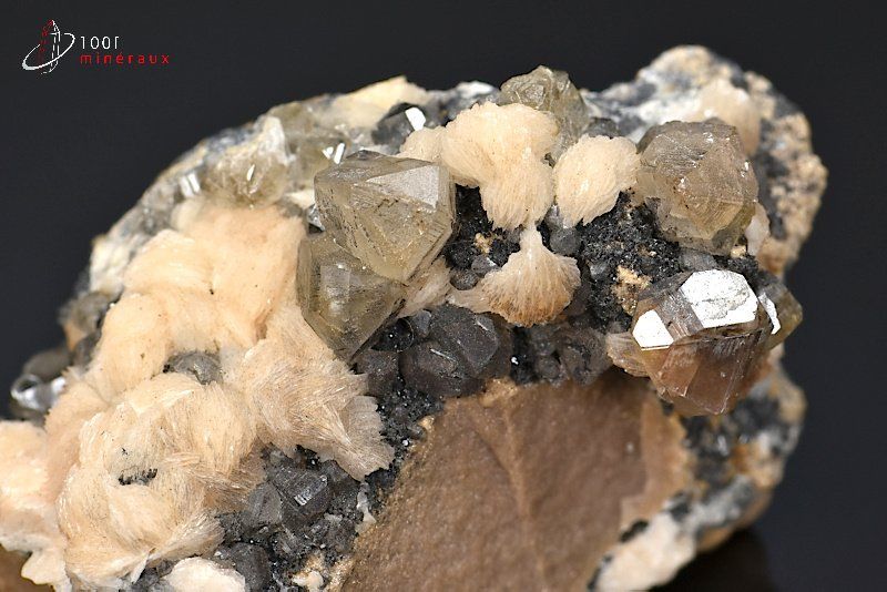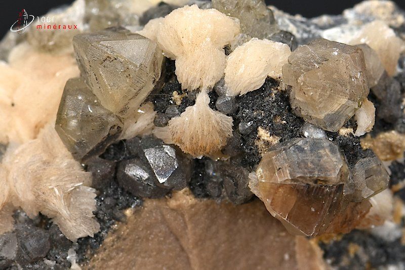Très belle composition de cristaux translucides de Cérusite, de Baryte rosée et de Galène noire.