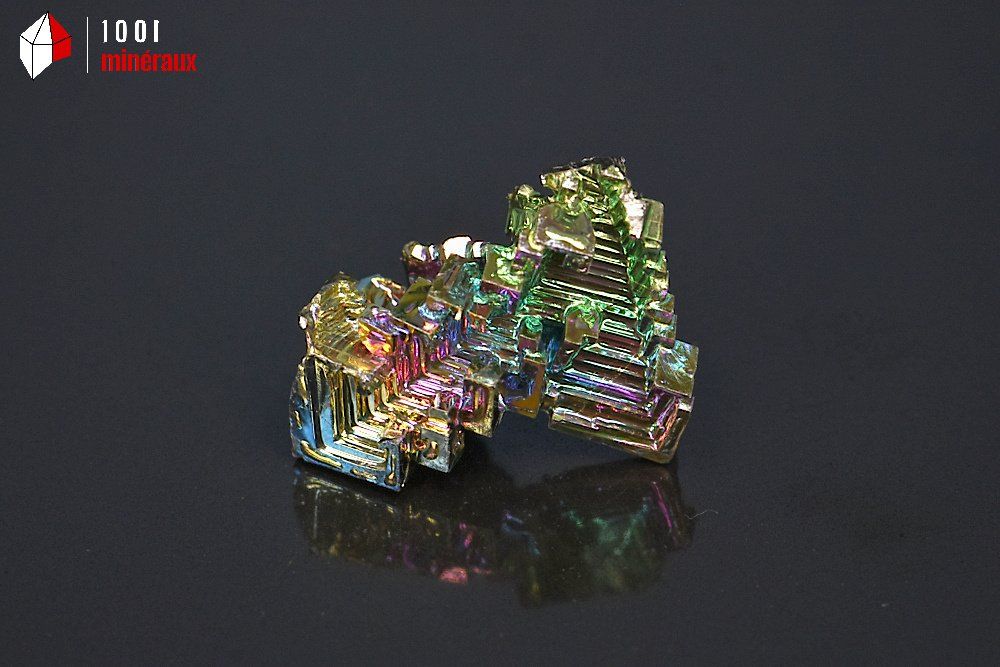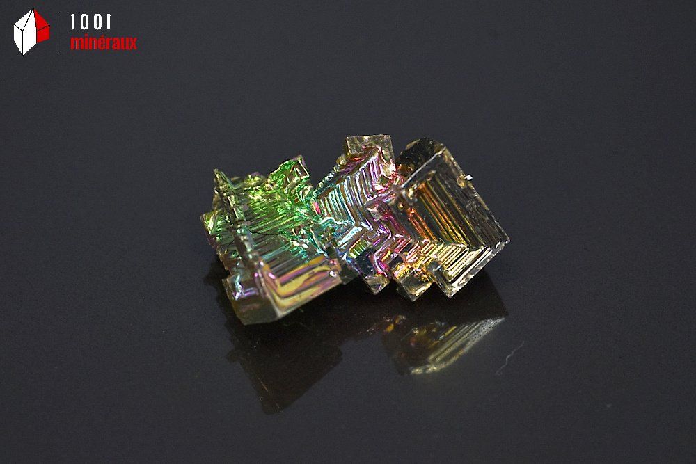 Joli spécimen d'une cristallisation artificielle de Bismuth bleu, vert, rose et jaune.