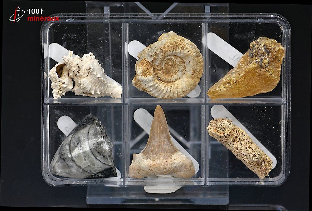 Ensemble de 6 fossiles présentés dans une boîte transparente.