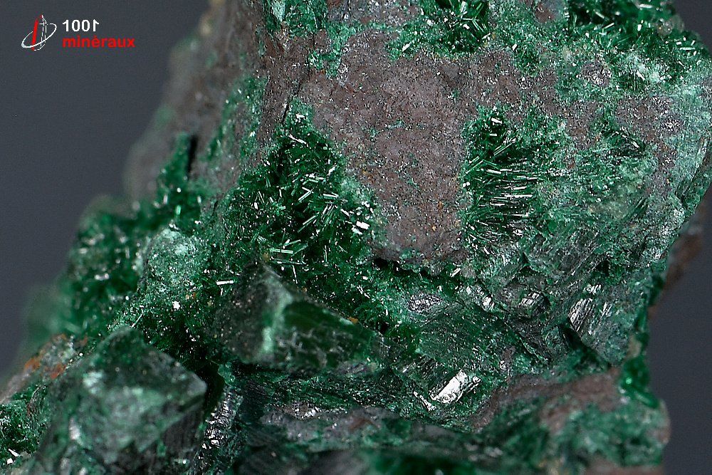 Joli revêtement de cristaux aciculaires vert foncé de Brochantite sur roche.
