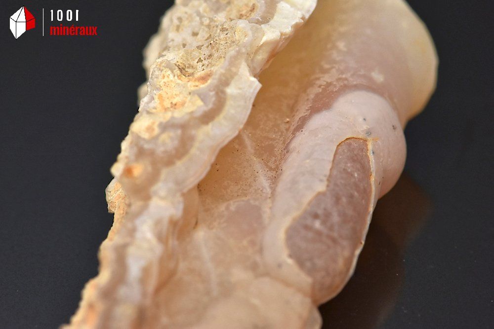 C'est une variété compacte cryptocristalline de Quartz car les cristaux sont si petits qu'il est difficle de les apercevoir. La CALCEDOINE se présente sous forme massive, mamelonnée, columnaire ou stalactitique. C'est une pierre très dure. L'Agate et l'Onyx en sont une variété zonée.