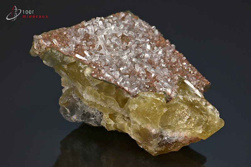 Spécimen de Calcite cristallisée translucide sur Fluorine jaune.