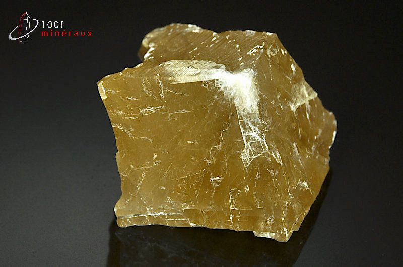 Spécimen d'une Calcite miel montrant les stries et les lignes de clivage spécifiques.