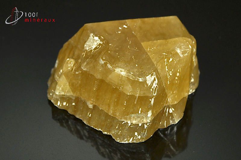 Spécimen d'une Calcite miel montrant les stries et les lignes de clivage spécifiques.