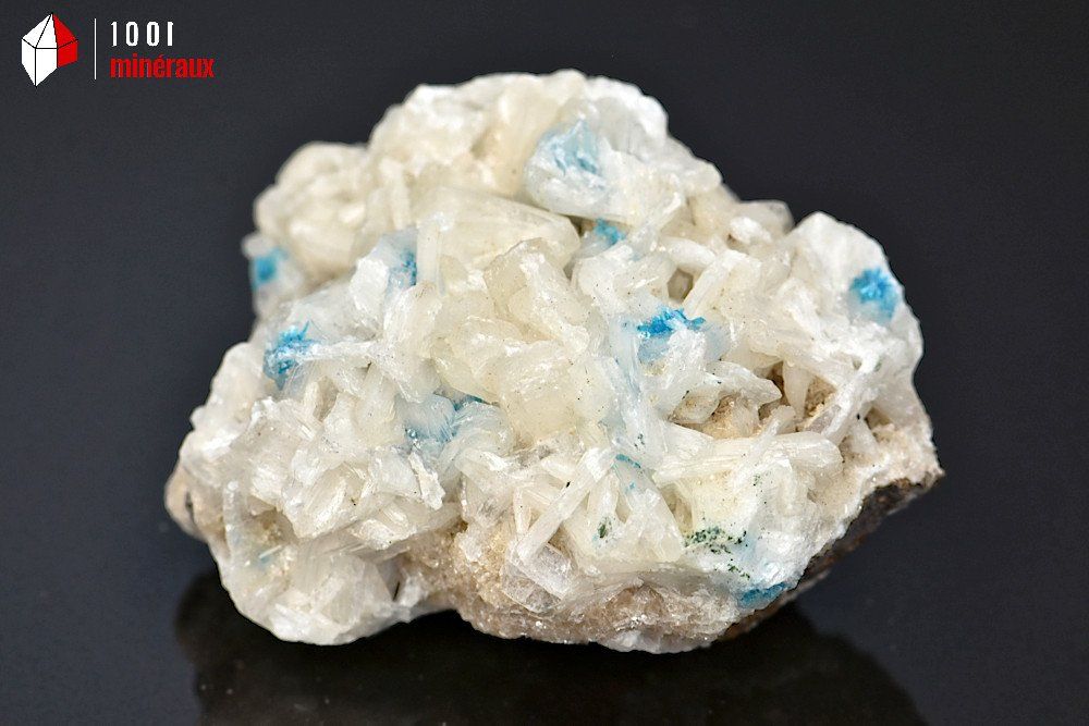Spécimen de plusieurs cristaux bleus de Cavansite sur Stilbite blanche.