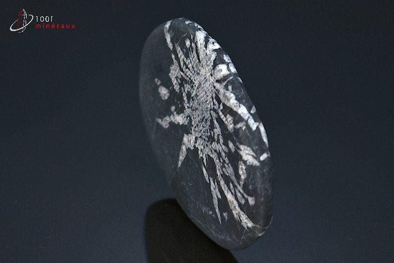 Pièce rare d'une Chrysanthem stone ajoutant un grand intérêt dans une collection. Très beau contraste blanc sur noir.