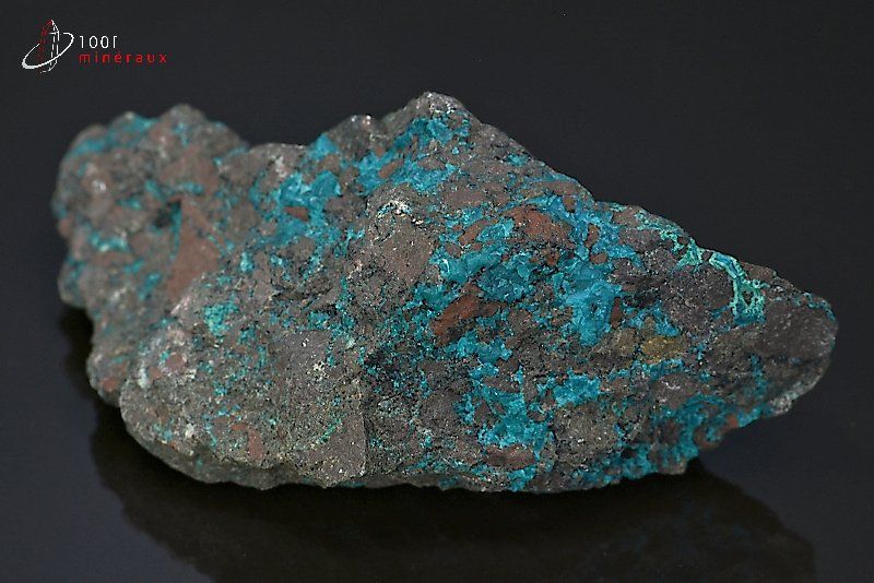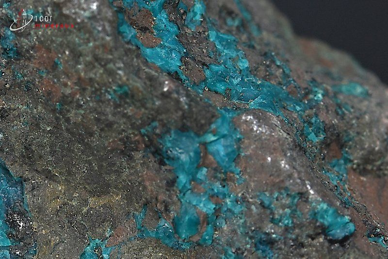 Spécimen d'un agrégat de Chrysocolle bleue sur roche noire.