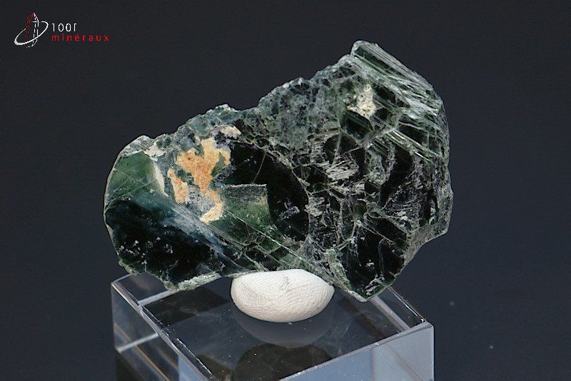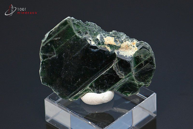 Spécimen de cristaux lamellaires de Clinochlore dont la couleur vert foncé est caractéristique. Présentation sur socle.