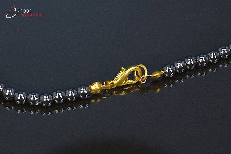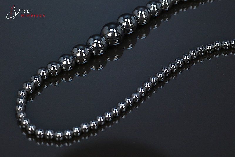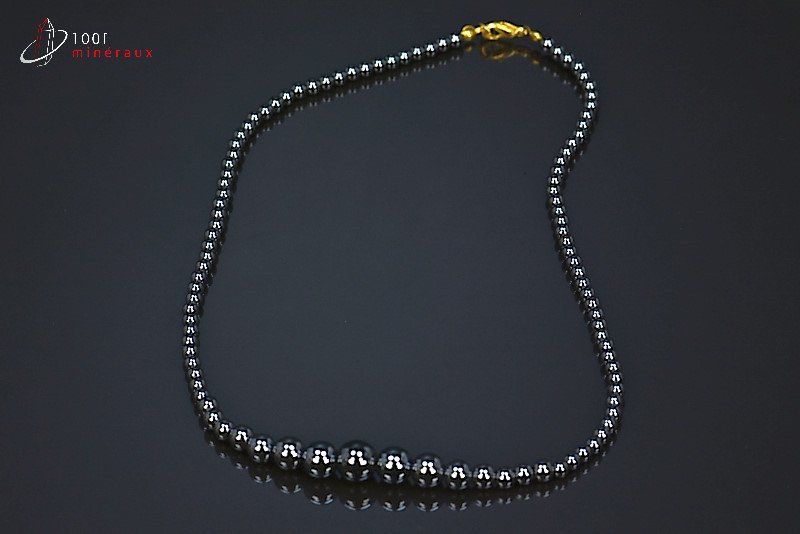 Très joli collier composé de perles rondes (9 à 3 mm) en Hématite avec fermoir doré.