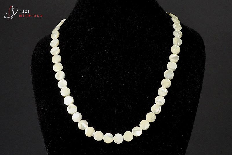 Collier très chic composé de disques 1 cm en Nacre dans les tons blanc cassé.