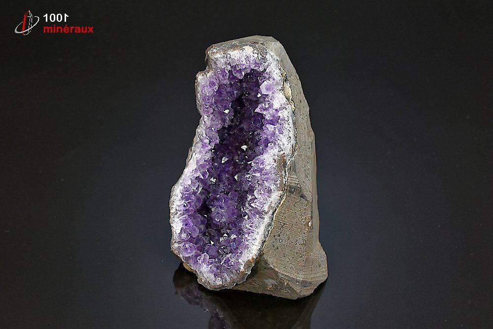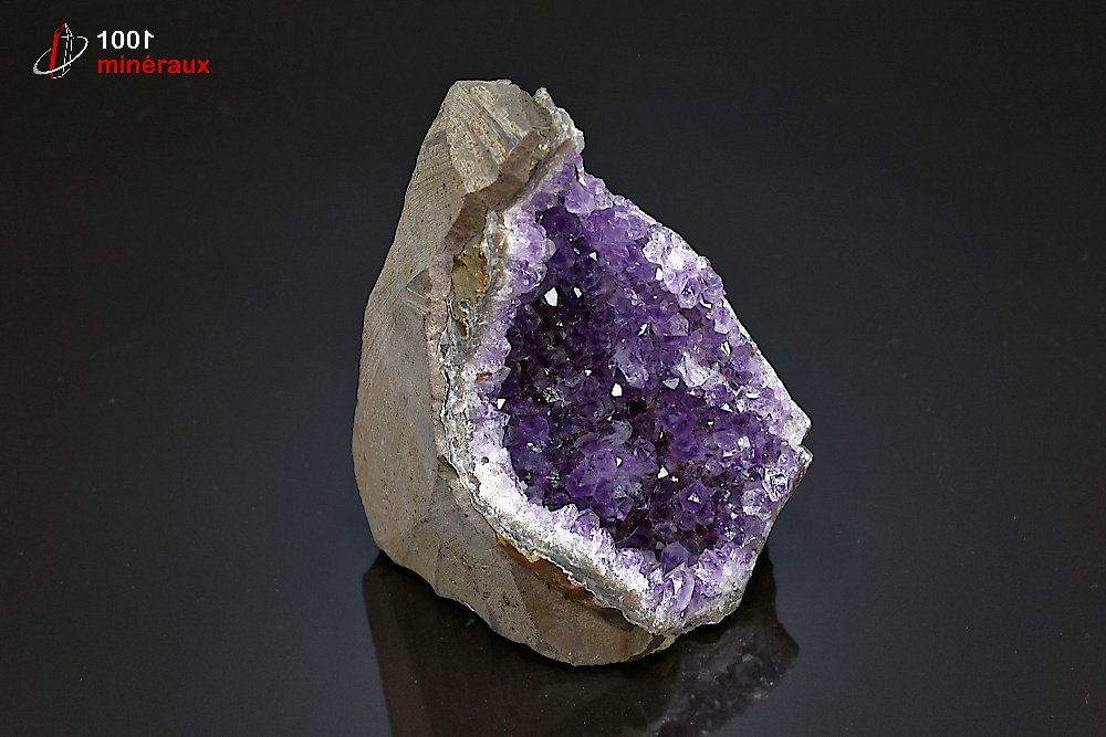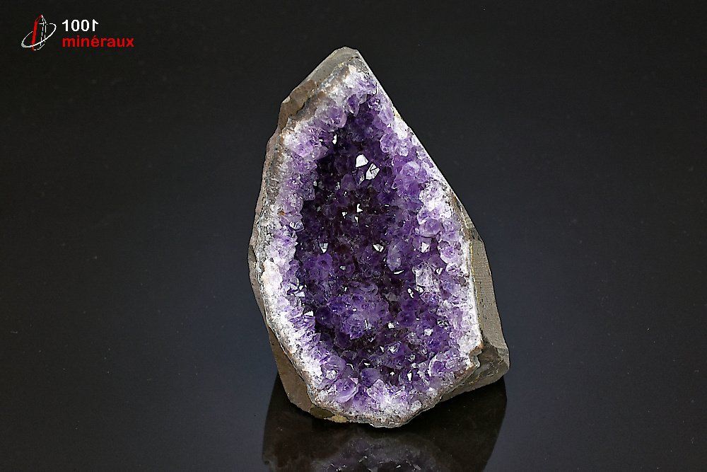 L' AMETHYSTE appartient au groupe des silicates. Elle contient essentiellement du silicium. Sa formule chimique est la même que celle du Quartz ou de l'Agate. C'est une variété de Quartz de couleur violette due au fer qu'elle renferme. L' Améthyste de couleur jaune se nomme citrine. L' Améthyste se trouve généralement dans des géodes et celles du Brésil produisent de gros cristaux pyramidaux, tandis que celles de l'Uruguay sont d'un violet profond.
