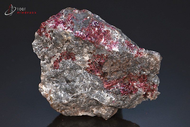 Spécimen d' Erythrine présentant un groupe de cristaux prismatiques aux reflets métalliques rose-violet, sur roche.