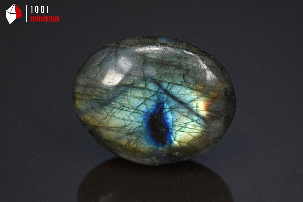 Les couleurs renvoyées sont des bleus particulièrement profonds, du jaune doré, de l'orange, du vert, du mauve et du blanc. L'origine du mot Labradorite provient de la presqu'île du Labrador au Canada.