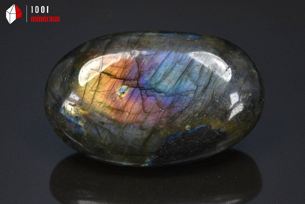 Les couleurs renvoyées sont des bleus particulièrement profonds, du jaune doré, de l'orange, du vert, du mauve et du blanc. L'origine du mot Labradorite provient de la presqu'île du Labrador au Canada.