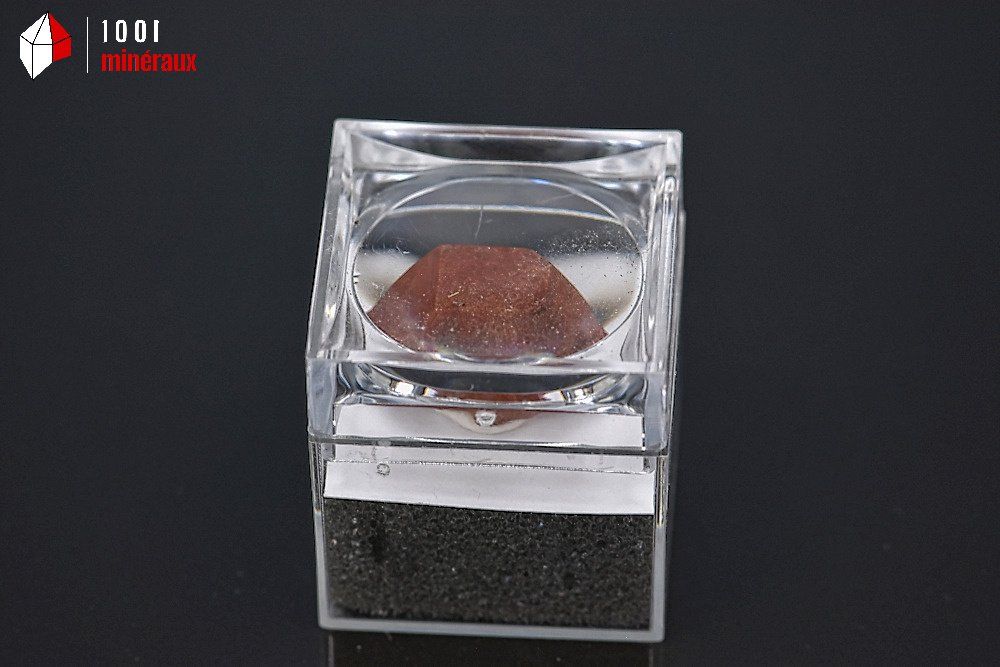 Spécimen d'un cristal d'une Hyacinthe ou Zircon rouge, présentée dans un boîtier-loupe transparent.