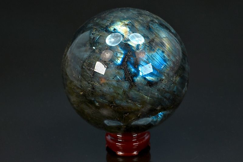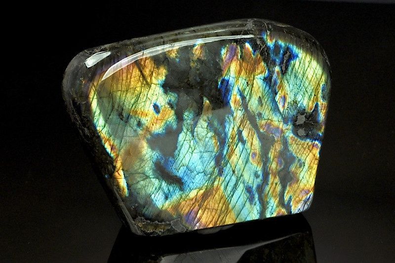 Magnifique spécimen de Labradorite polie en galet, présentant d'extraordinaires reflets zébrés bleus et jaunes.
