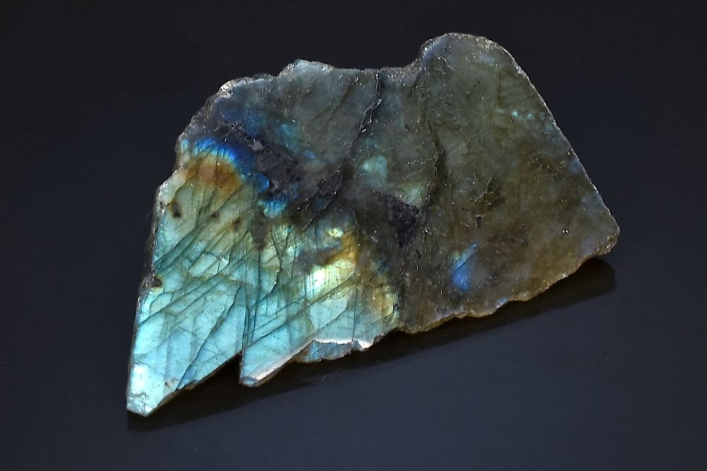 Spécimen de galet de Labradorite polie, présentant des reflets bleus, orangés et jaunes.