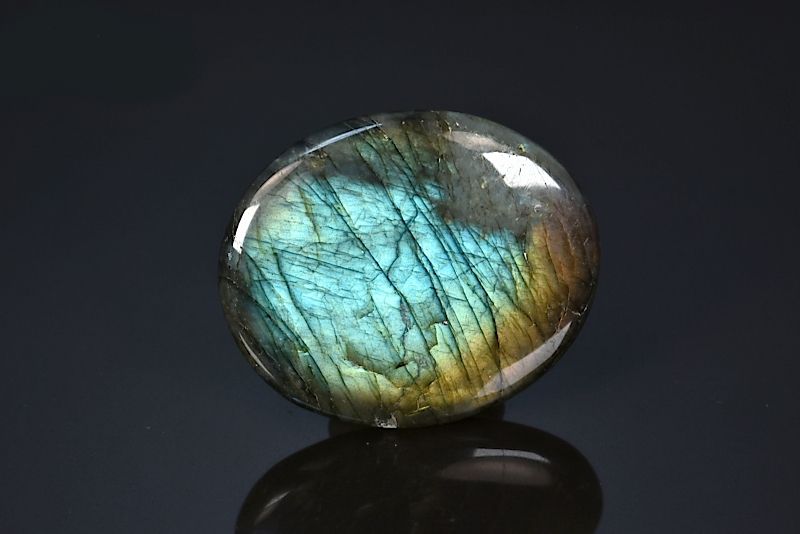 Magnifique spécimen d'un grand galet de Labradorite polie, présentant d'extraordinaires reflets bleus et jaunes.