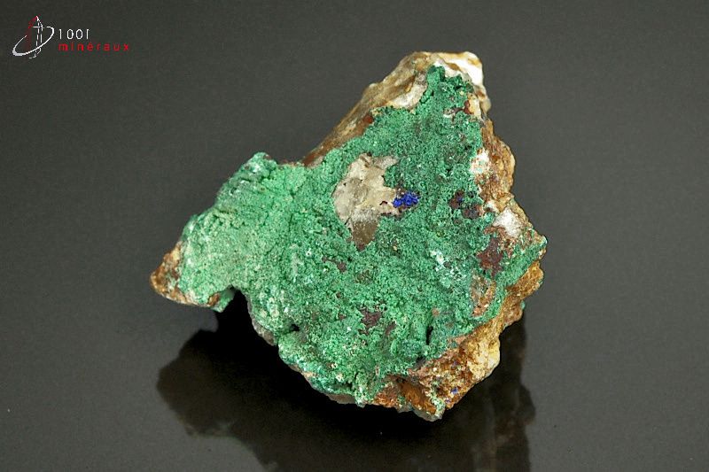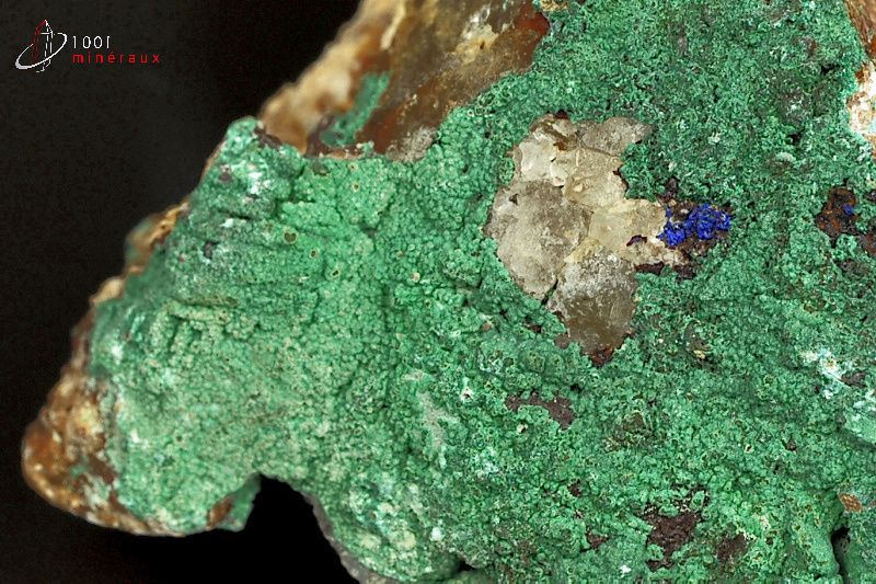 Spécimen de Malachite présentant une cristallisation en croûte verte avec présence d'Azurite bleue.