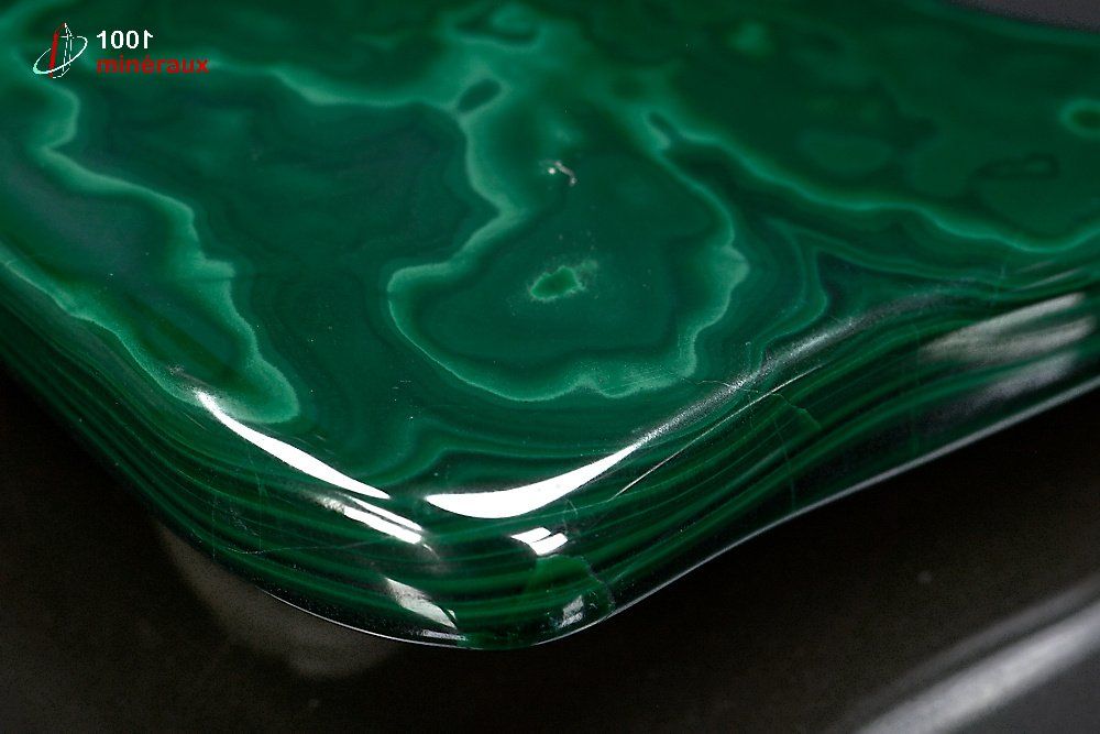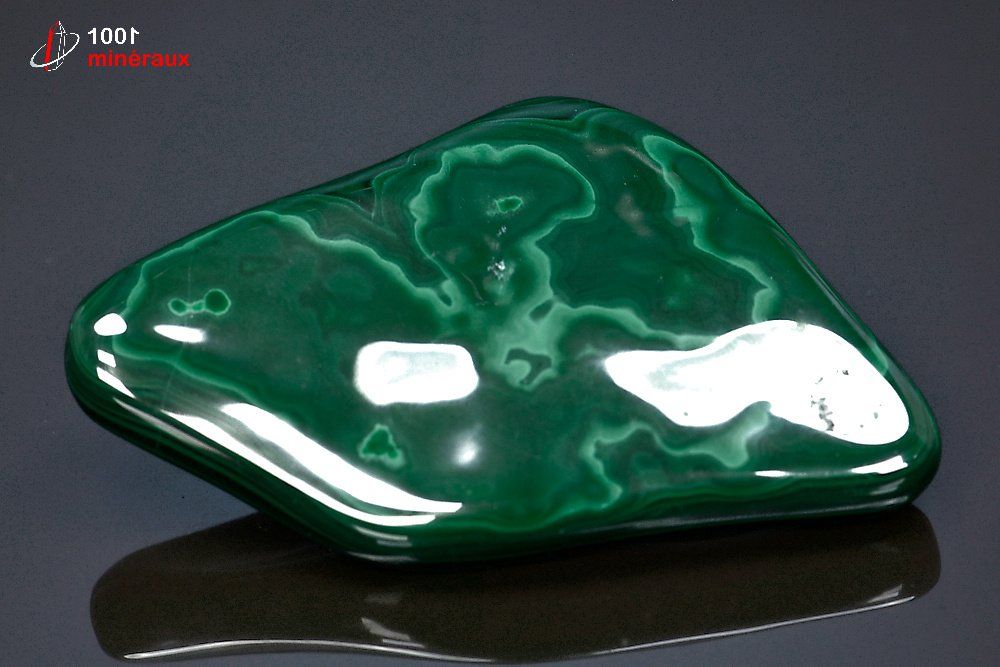 Joli spécimen d'une pierre de Malachite forme libre polie aux jolis dessins.