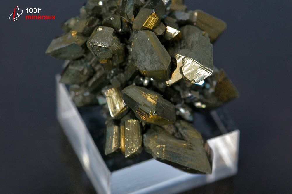 Spécimen d'une Marcassite présentant de nombreux cristaux tabulaires aux reflets métalliques dorés. Présentation sur socle.