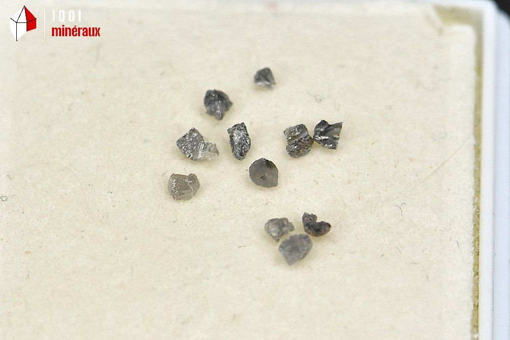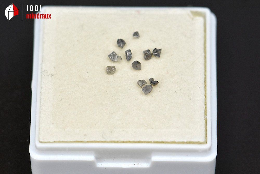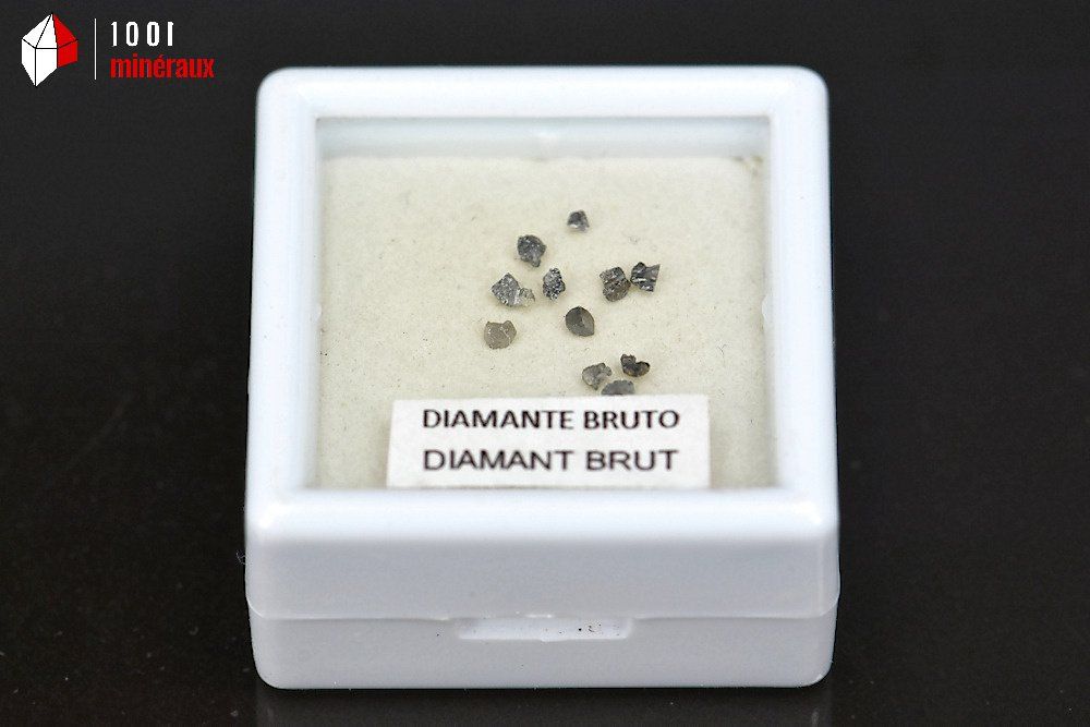 Présentation de microcristaux de diamants bruts dans un boîtier au couvercle transparent.