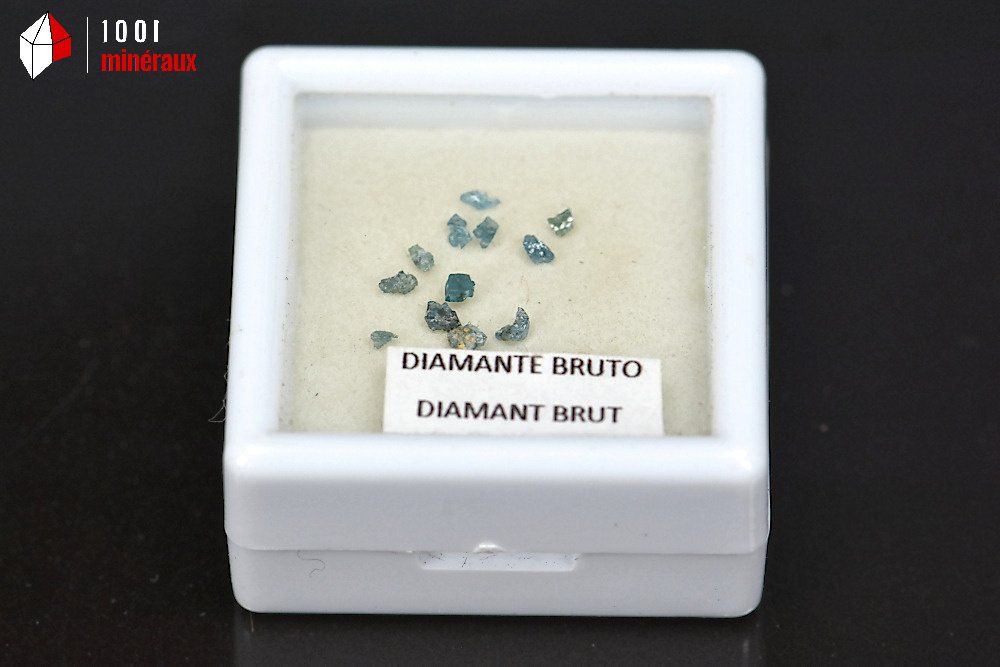 Présentation de microcristaux de diamants bruts dans un boîtier au couvercle transparent.