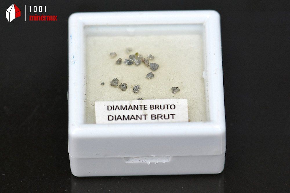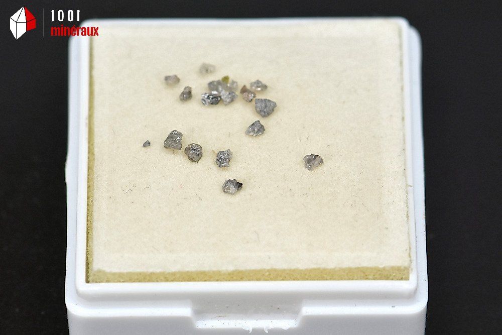 Présentation de microcristaux de diamants bruts dans un boîtier au couvercle transparent.