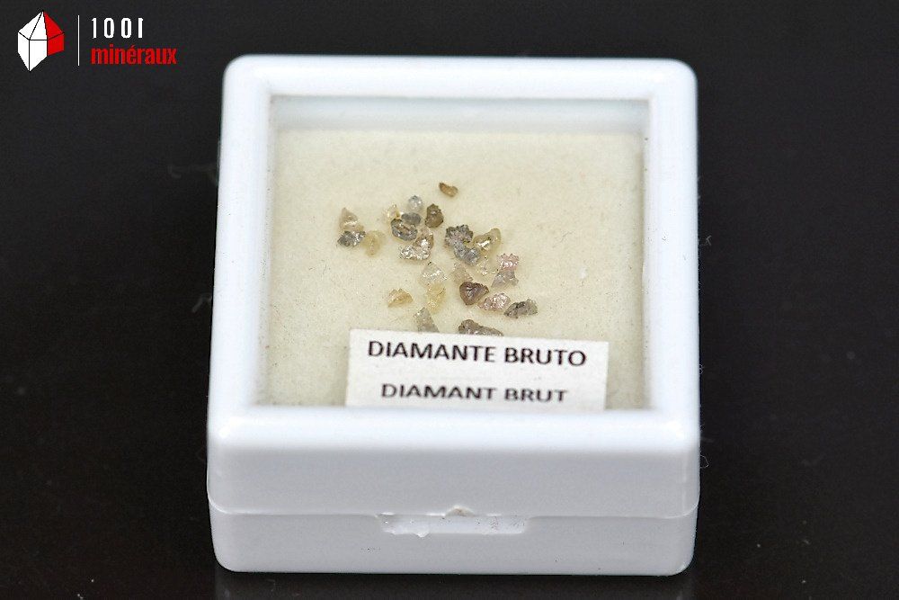 Présentation de microcristaux de diamants bruts dans un boîtier au couvercle transparent.