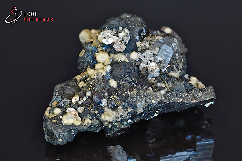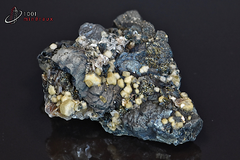 Très beau spécimen de Mispickel ou Arsénopyrite présentant des reflets métalliques avec de nombreux cristaux hexagonaux jaunes d'Apatite et des cristaux lamellaires de Muscovite.