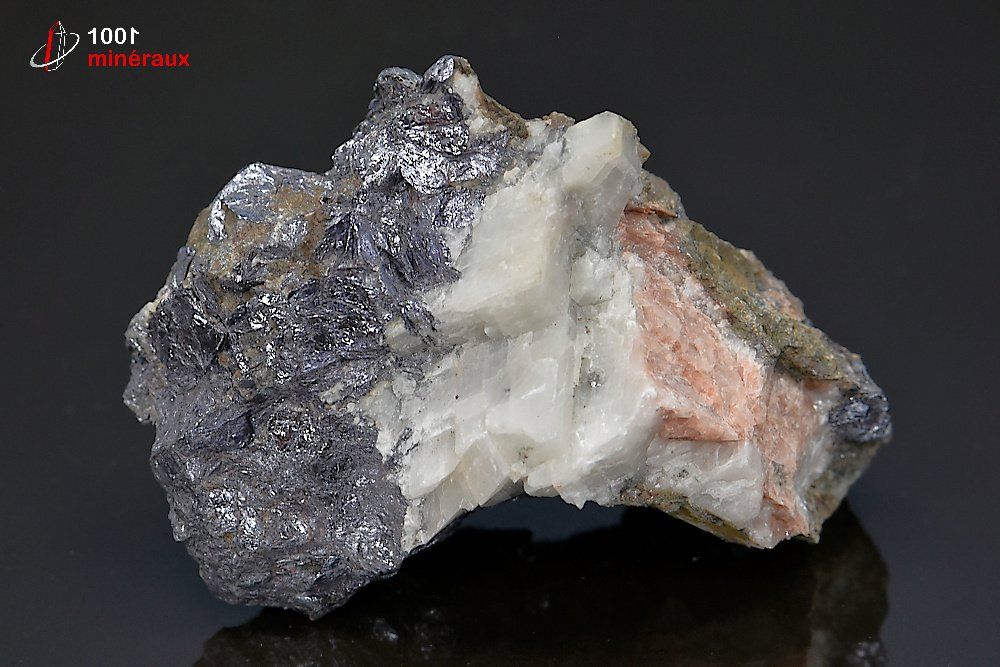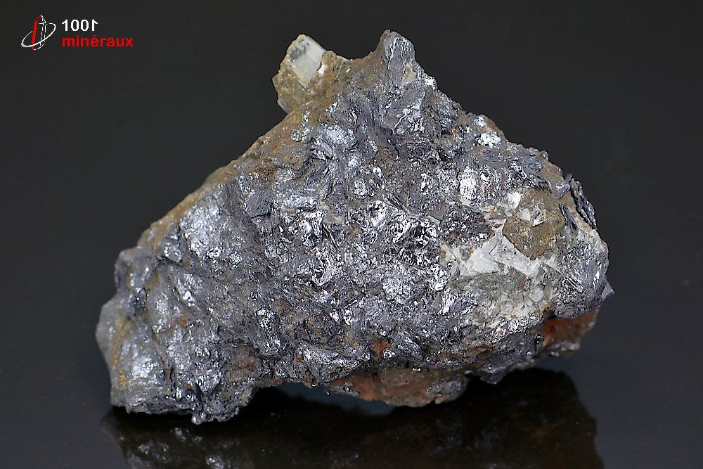 Spécimen de Molybdénite aux reflets métalliques gris sur Quartz.