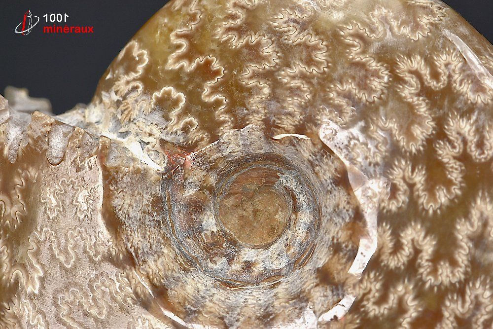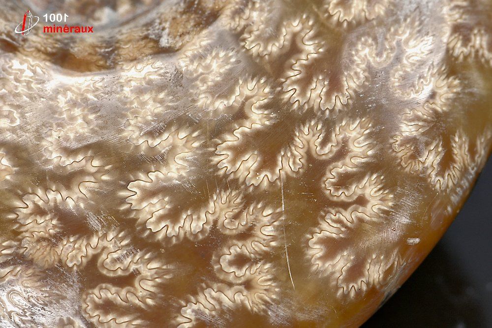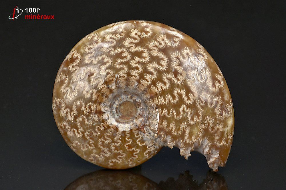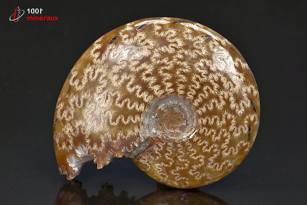 Très joli Nautile fossile poli mettant en évidence les sutures dendritiques (en lien avec les fractales).
