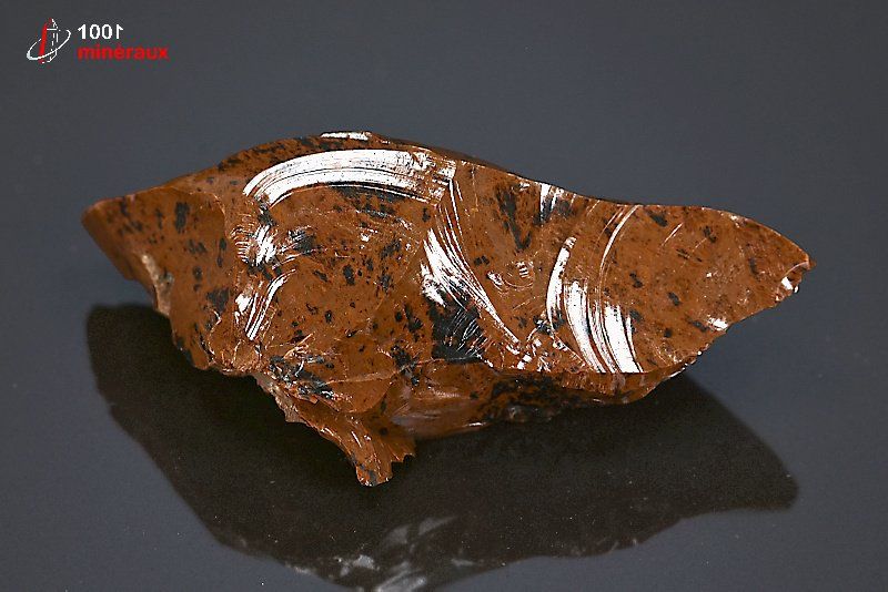 Spécimen d'une Obsidienne brune révélant des fractures conchoïdales. La couleur brune indique la présence d'Hématite.