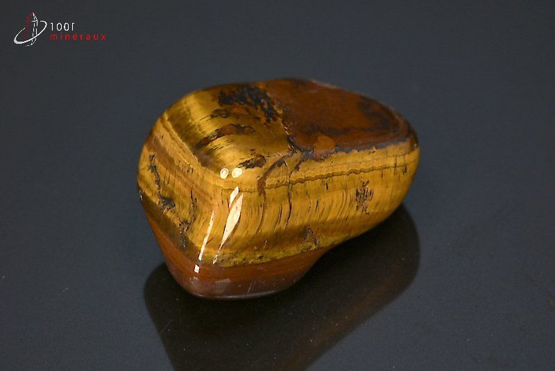 L' OEIL DE TIGRE appartient au groupe des silicates. Il contient essentiellement du silicium et a la même formule chimique que le Quartz. C'est une variété de calcédoine. Il se présente sous forme massive microcristalline. C'est une pierre très dure. L'alternance de bandes provient de la combinaison avec un autre minéral riche en fer, la Riebeckite. Il existe plusieurs sortes d'yeux : l' OEIL DE TIGRE, l' OEIL DE TAUREAU (le plus souvent Oeil de Tigre chauffé), l' OEIL DE CHAT, l' OEIL DE FAUCON, l' OEIL DE FER.