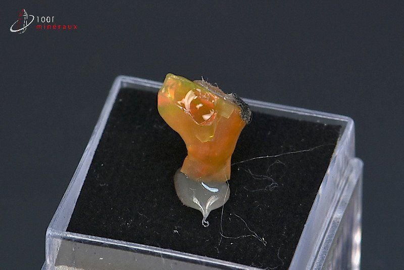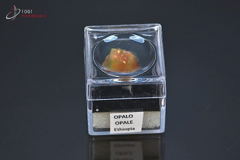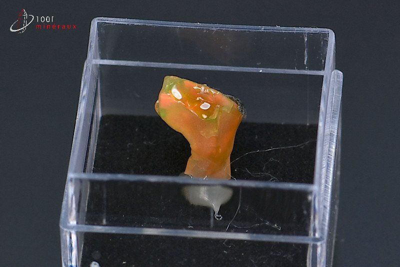 Spécimen d'Opale brute translucide aux reflets verts et rouges. Présentation en boîtier.