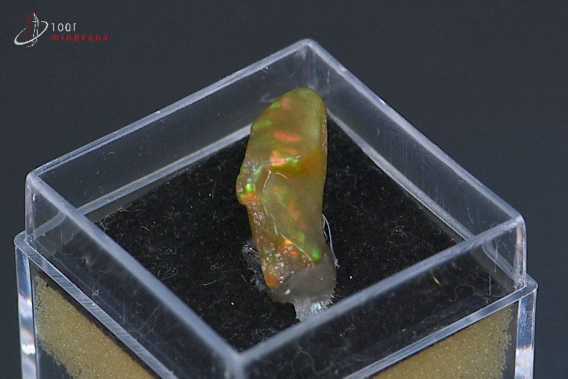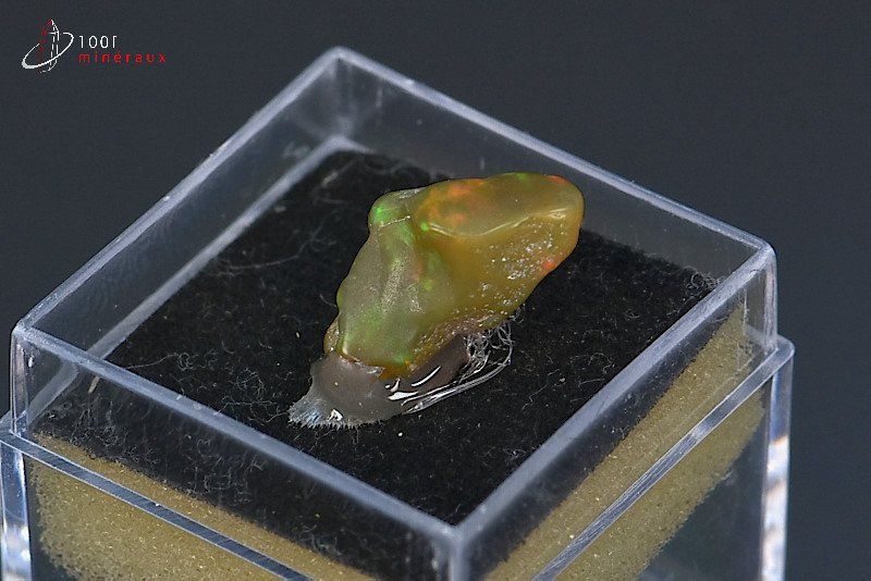 Spécimen d'Opale brute translucide aux reflets verts et rouges. Présentation en boîtier.