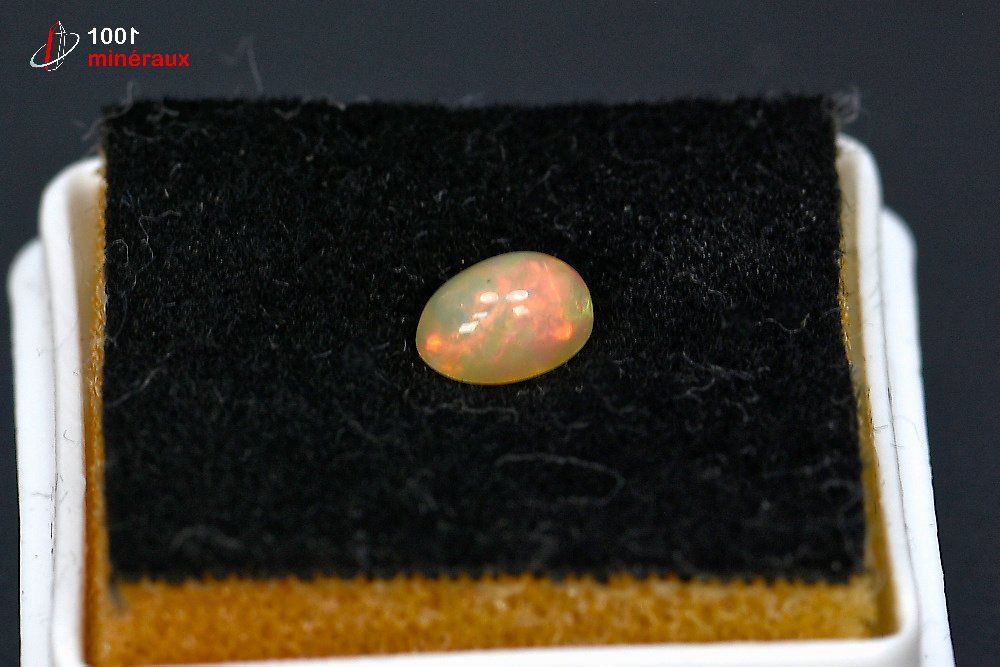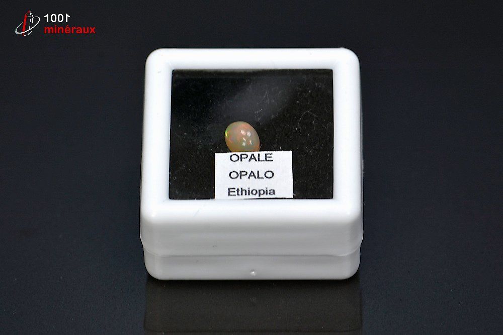Spécimen d'une Opale polie présentée dans un boîtier transparent.