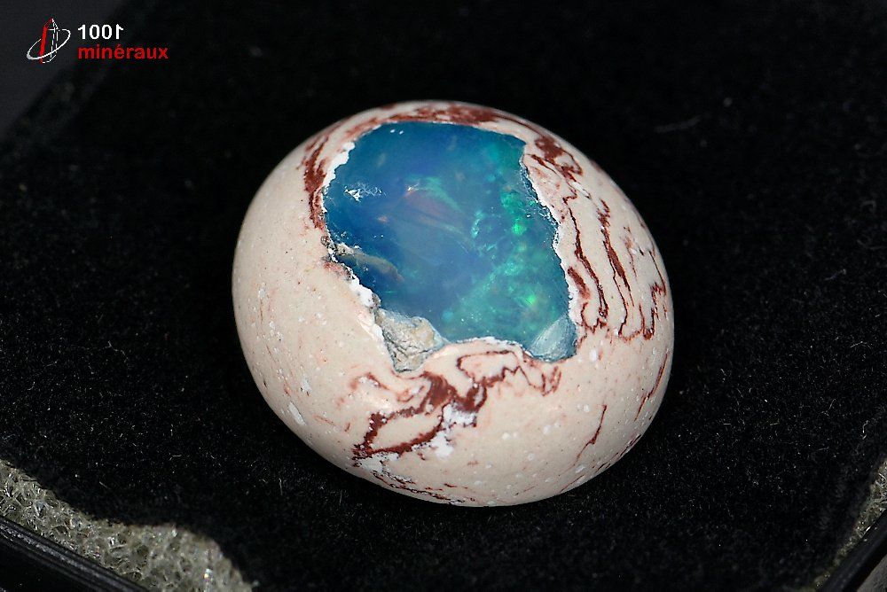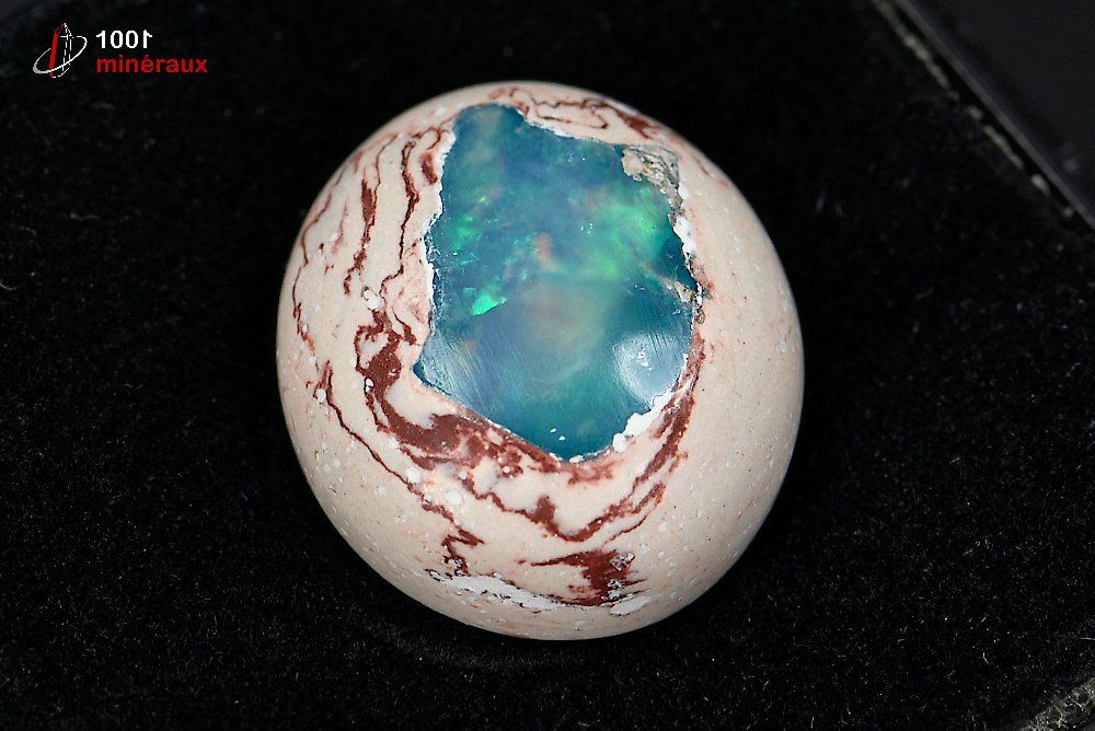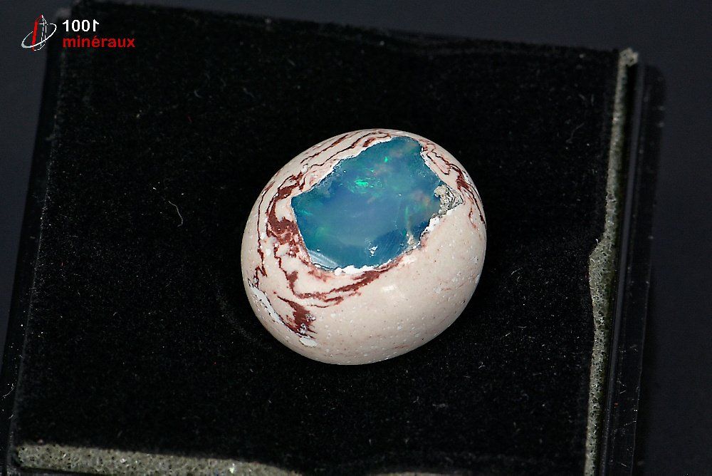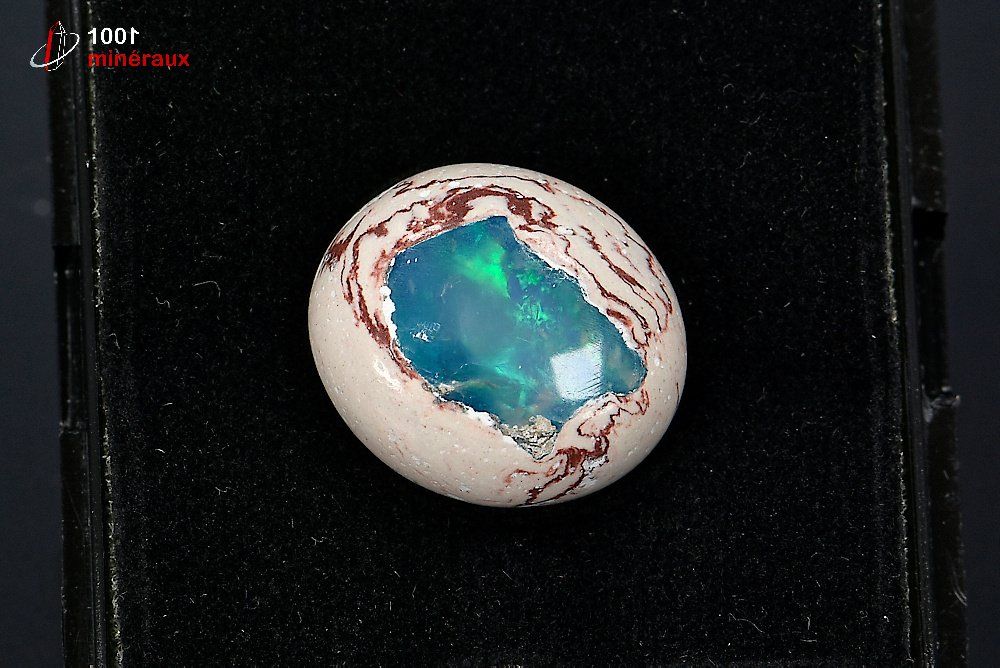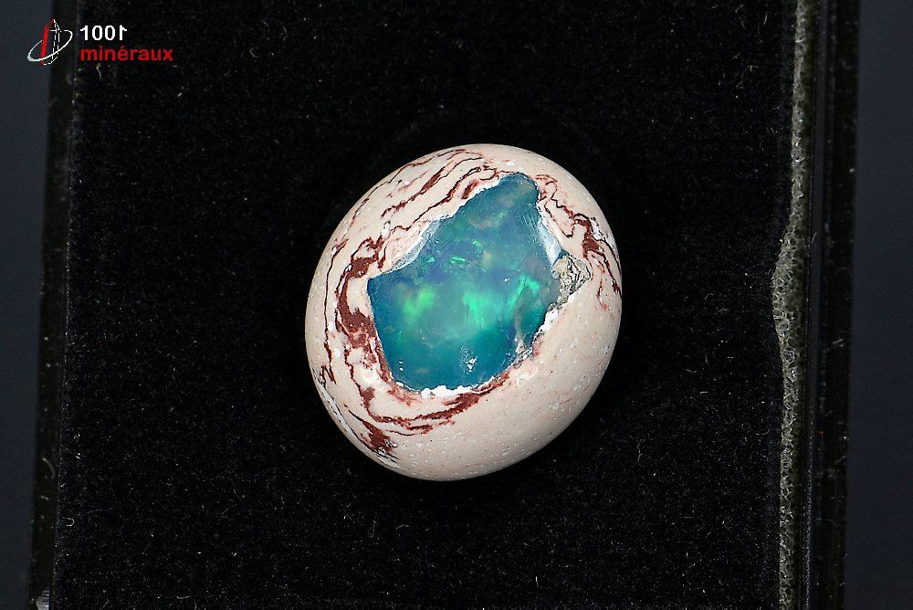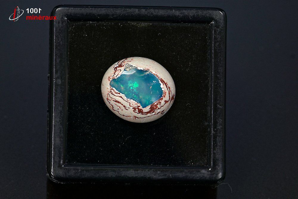 Spécimen d'une Opale polie présentée dans un boîtier transparent.