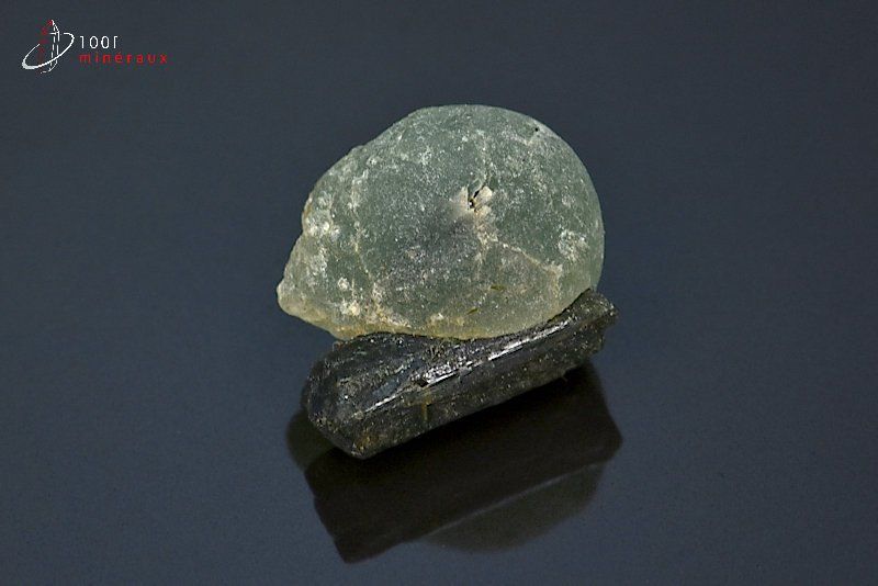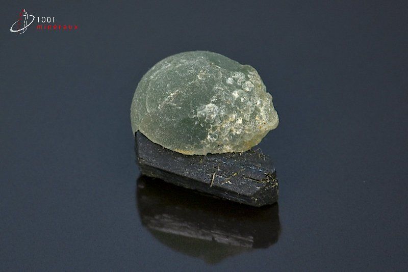 Spécimen présentant une sphère de Prehnite verte translucide sur des cristaux d' Epidote vert-noir.