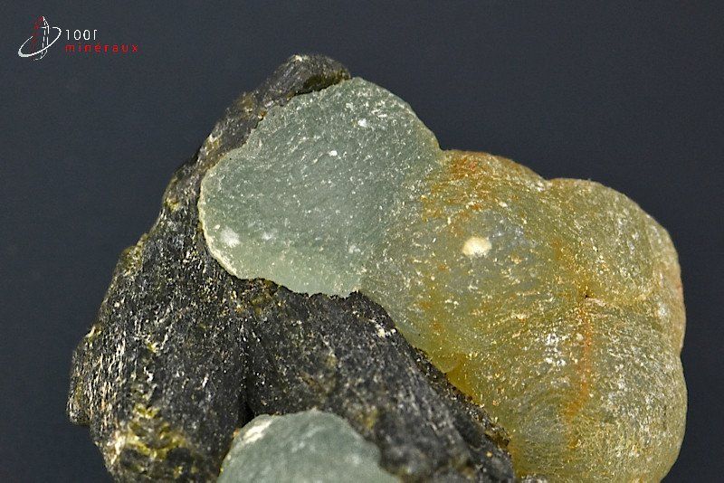 Spécimen présentant des sphères de Prehnite vert-translucide sur des cristaux d' Epidote vert-noir.