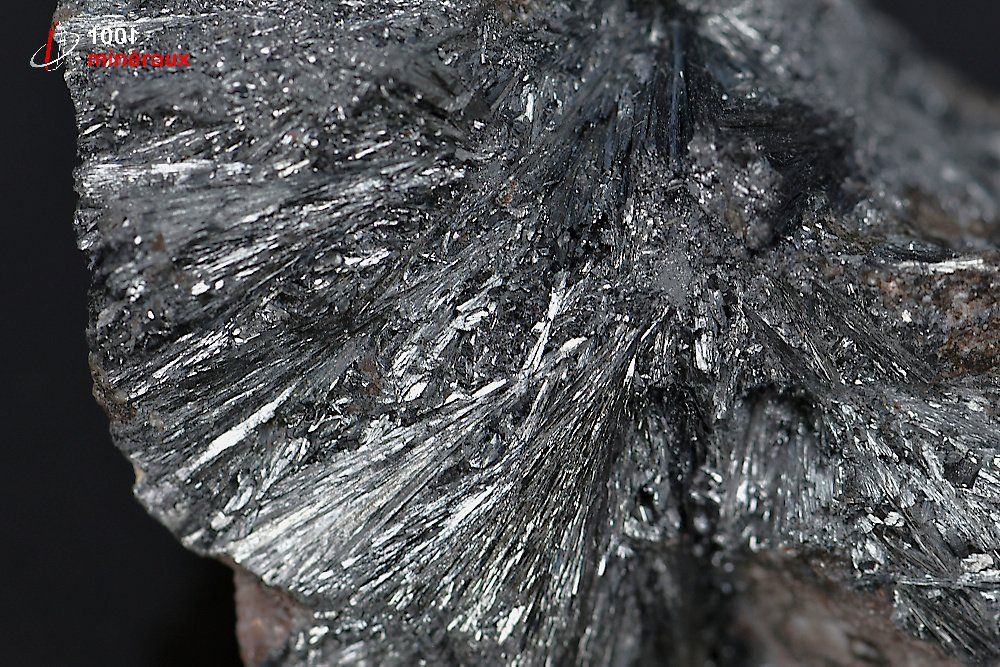 Spécimen sur matrice rocheuse de cristaux rayonnants de Pyrolusite de Manganèse aux reflets métalliques gris.