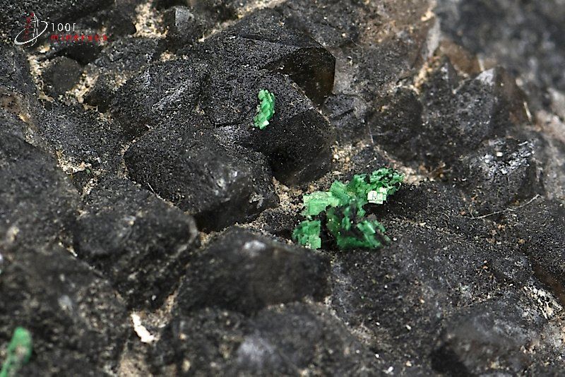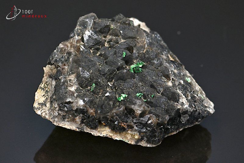 Très joli spécimen de cristaux de Quartz morion et de cristaux verts de Torbernite.