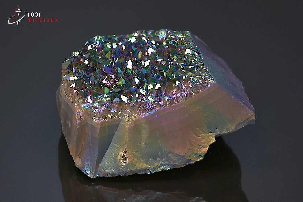 Le QUARTZ appartient au groupe des silicates. Il contient essentiellement du silicium. Il présente une forme massive ou des cristaux prismatiques. C'est un minéral très commun présent dans presque tous les types de roche. Sa dureté sur l'échelle de Mohs est de 7 / 10 ! Le QUARTZ titane est un quartz sur lequel a été pulvérisé du titane sous vide, ce qui lui donne ses reflets multicolores.