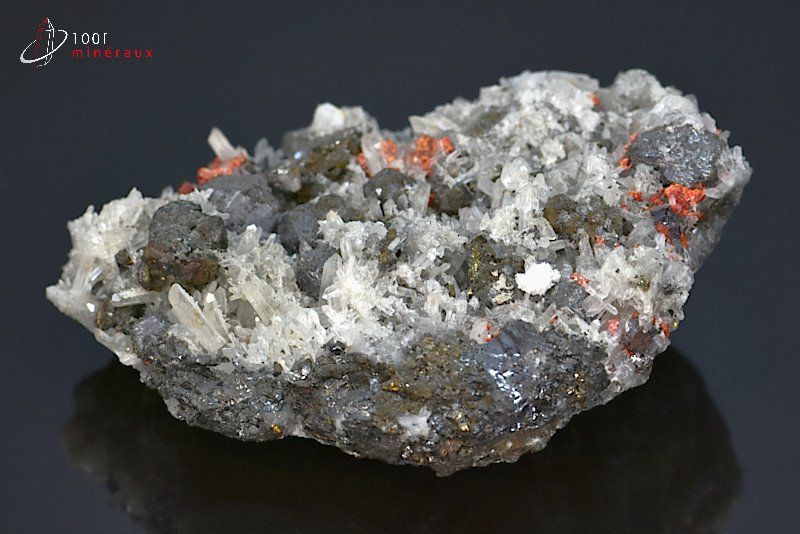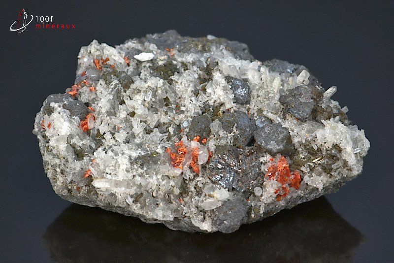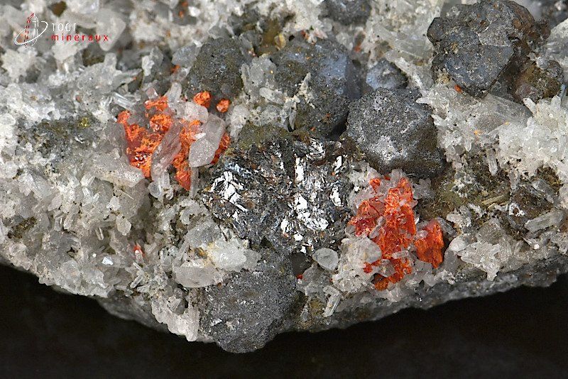 Très intéressant spécimen de cristaux de Réalgar orangés et de Quartz sur Galène noire.