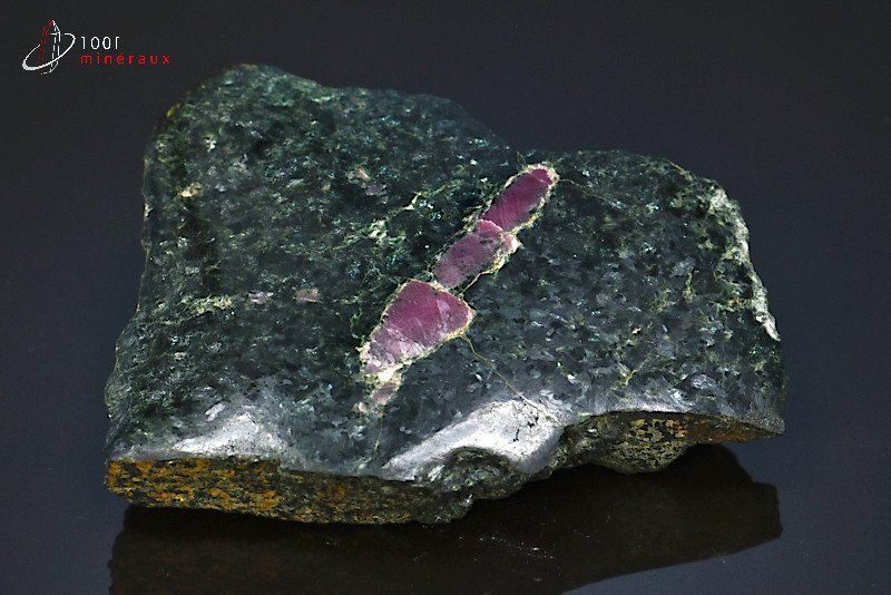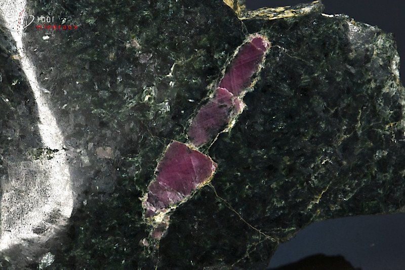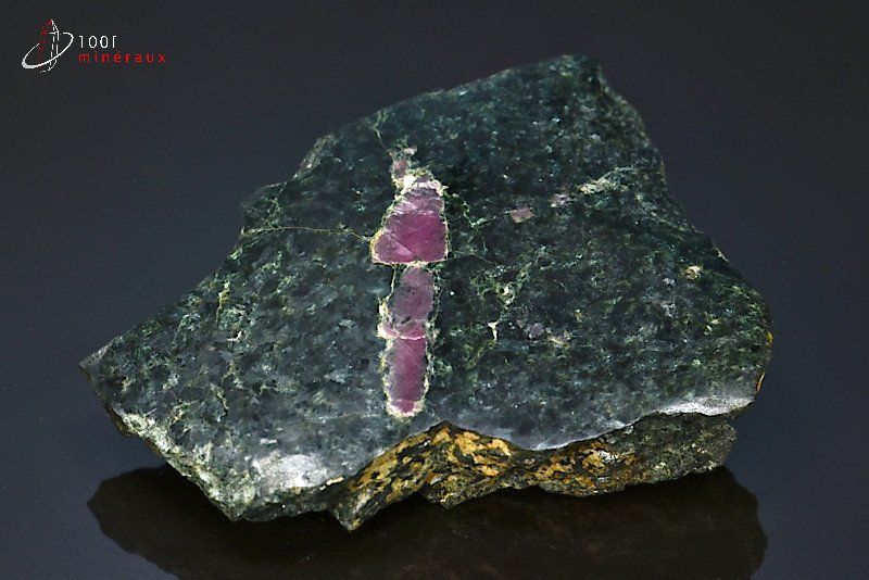 Très belle plaque polie de Rubis corindon sur Amphibolite.