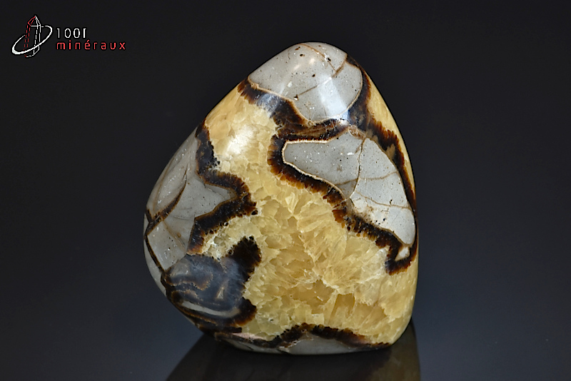 La SEPTARIA est le résultat du développement d' un réseau de fissures remplies de calcaire dans un nodule. Un nodule est un corps d'une forme plus ou moins sphérique et en général plus dur que les roches qui le contiennent. La présentation d'un nodule s'effectue en sciant celui-ci en 2 parties égales, et en polissant ensuite les surfaces internes afin d'en faire ressortir les fissures. La septaria est le plus souvent de couleur gris brun à noir, et brun foncé à blanc pour les fissures.