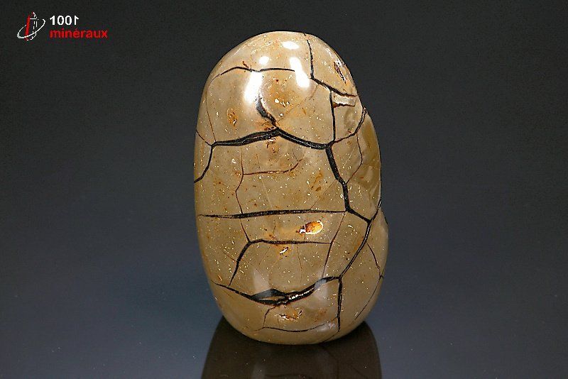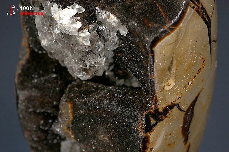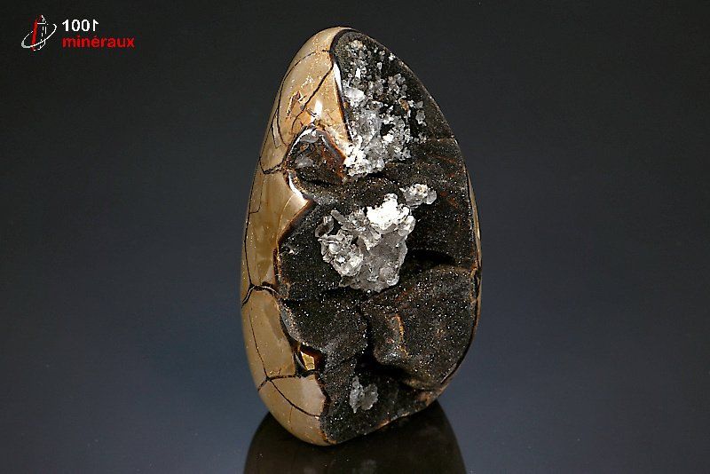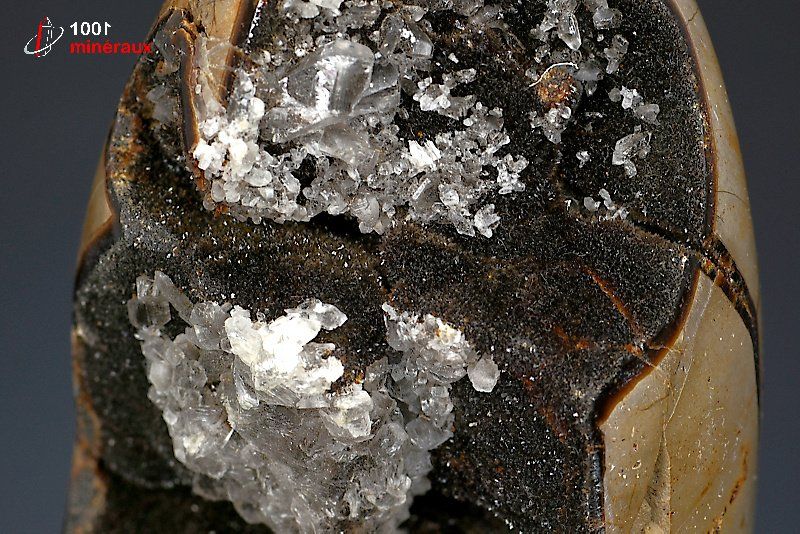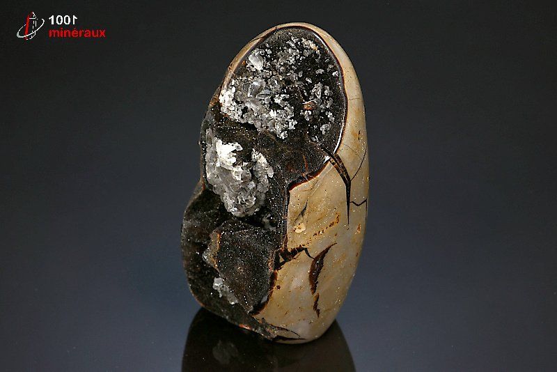 Magnifique spécimen d'un nodule de Septaria poli extérieurement montrant les veines de Calcite brun foncé à l'extérieur. Double cristallisation de Quartz et de Calcite noire à l'intérieur.